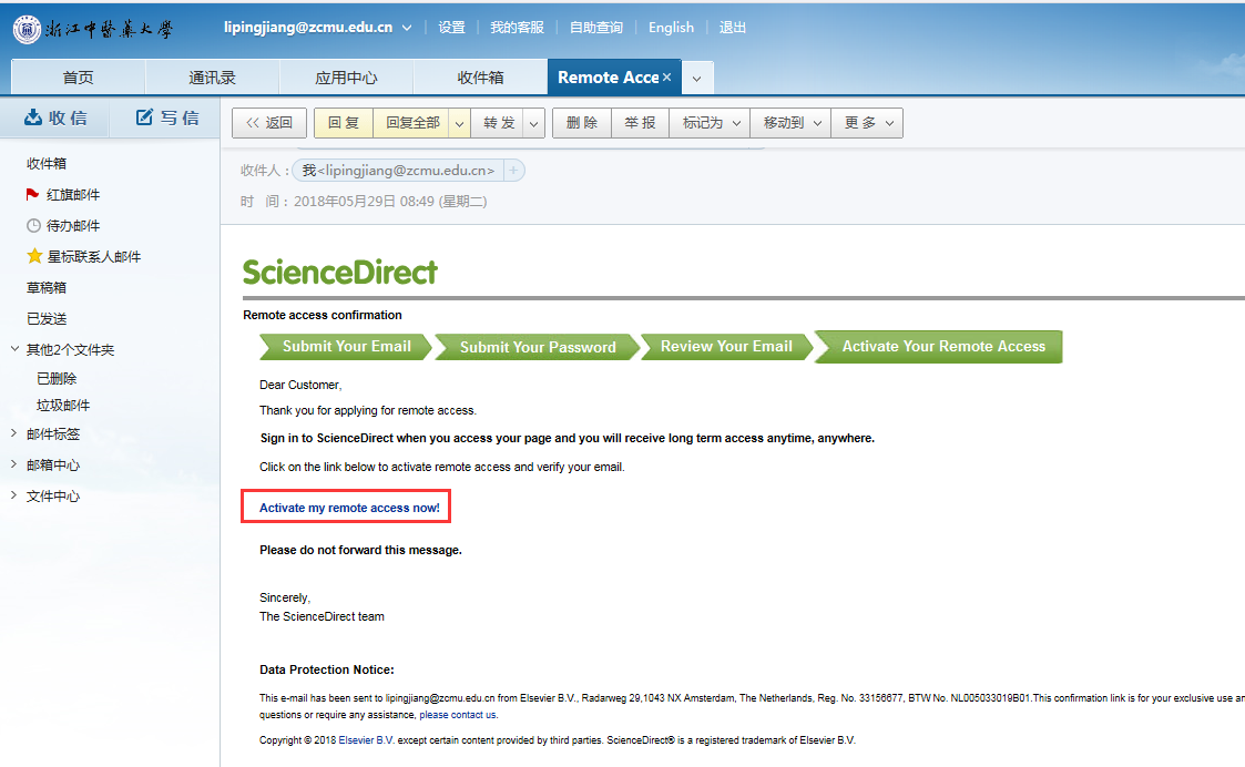 步骤4:到邮箱里点击Activate my remote access now激活Remote Access(可能被投放到垃圾邮箱中,请注意查看)。