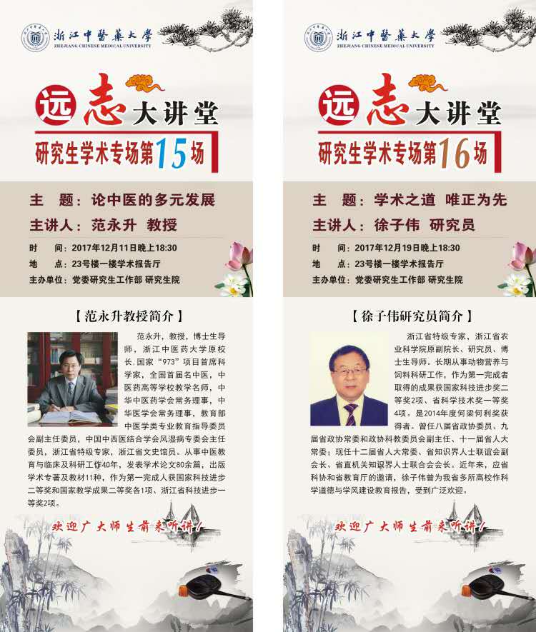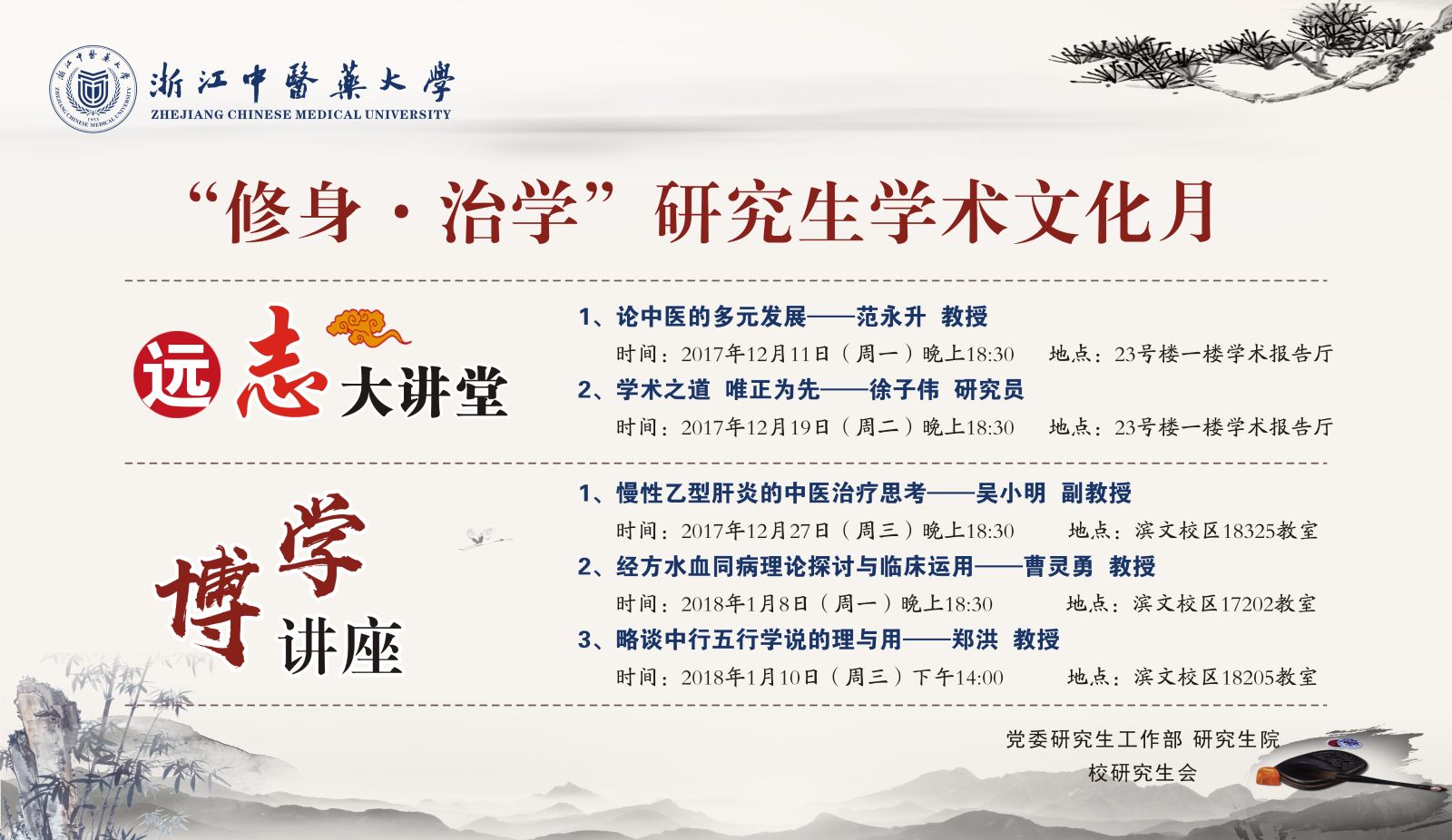 本次“修身▪治学”研究生学术文化月由两期远志大讲堂研究生专场、三期博学讲座组成,具体安排如下: