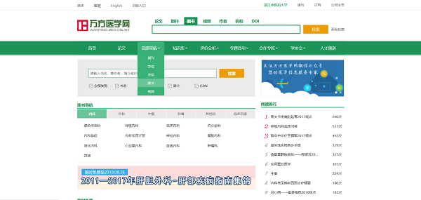 万方医学图书数据库是万方医学网推出的以医学图书为主要内容的知识服务系统,提供医学图书的检索、浏览、全文阅读等服务。该库包含人民军医出版社出版的6000多本图书全文,内容涉及内科、外科、科普类、中医类、儿科、妇产科、皮肤科、基础医学、教材教辅等医学图书资源。
