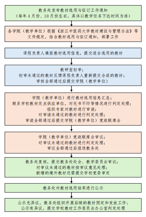 按照教育部《普通高等学校教材管理办法》、省教育厅《浙江省普通高等学校教材管理实施细则》要求,《万象城awcsport官网教材建设与管理办法》(浙中医大发〔2021〕72号)、《万象城awcsport官网“马工程”重点教材选用管理办法》等文件内容选用教材。