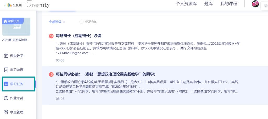 2.打开APP加入班级后,了解学习任务及须提交的作业,并在作业栏下载附件中的“2024年度思想政治理论课实践教学实施方案”,内含实践报告模板及具体要求: