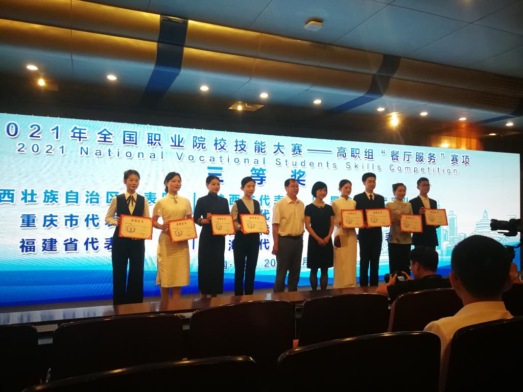 6月19日至23日,2021年全国职业院校技能大赛(高职组)“餐厅服务”赛项在青岛酒店管理职业技术学院举行,来自全国各地的32支代表队64名选手参赛。由今年会旅游与管理学院学生汤佳佳、张莹组成的陕西省代表队获该赛项三等奖。