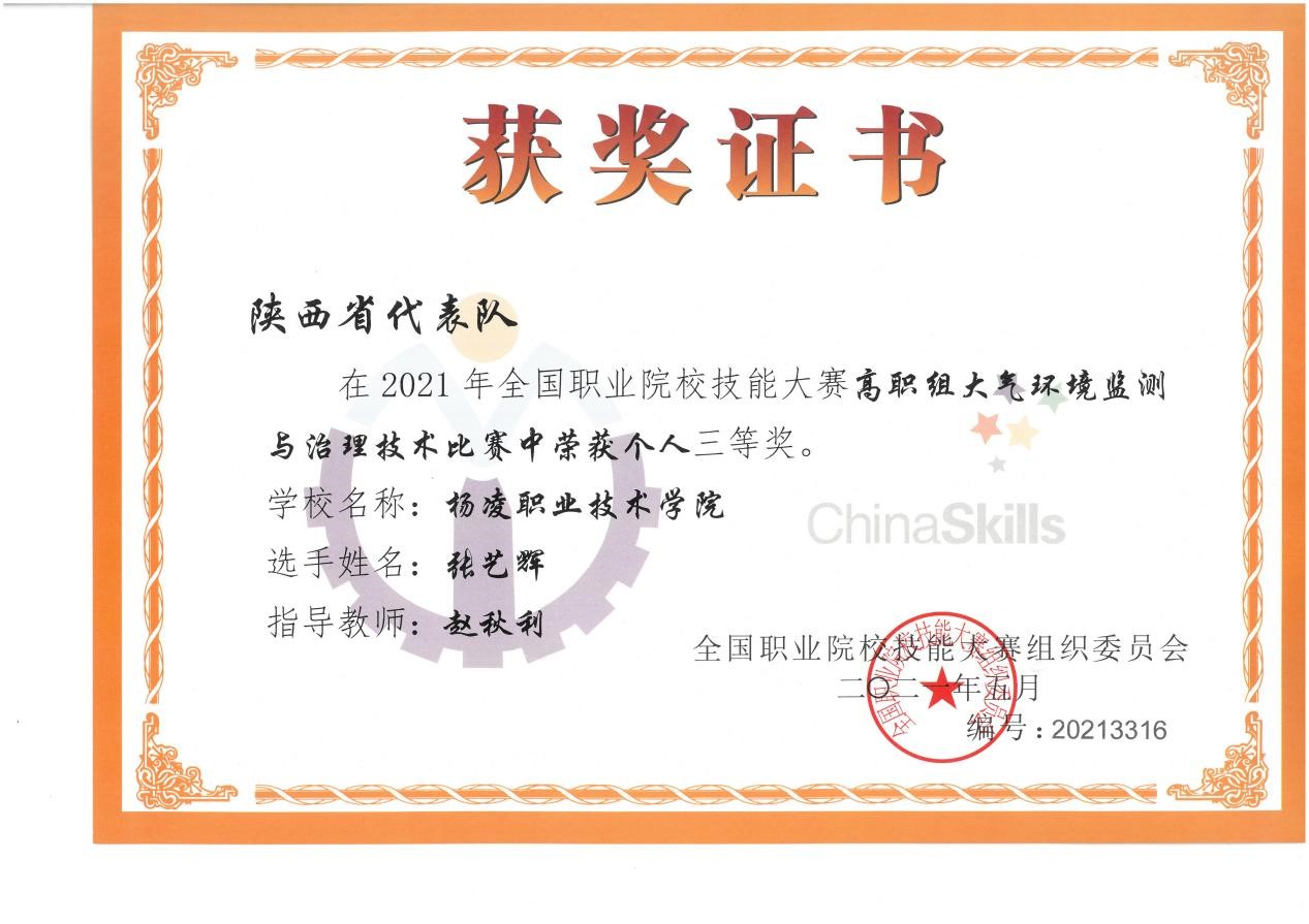 6月25日至27日,2021年全国职业院校技能大赛高职组“大气环境监测与治理技术”赛项在河北工业职业技术大学举办,来自全国各地26支代表队参赛,今年会赵秋利老师指导的2019级环境监测与控制技术专业学生张艺辉参赛,荣获大赛三等奖。