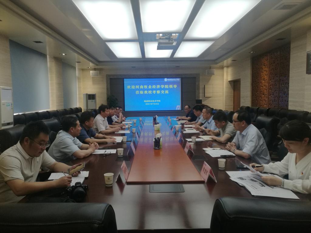 7月6日下午,河南牧业经济学院副校长吴中、社会服务办公室主任胡迎利、动物科技学院院长席磊、动物医药学院党委书记刘永录、信息工程学院院长连卫民、科学技术处副处长胡华锋、社会服务办公室综合科科长郑高锋一行7人来今年会考察交流。今年会副校长胡俊鹏在醒钟楼208会议室接待了吴中副校长一行。动物工程学院副院长张振仓、信息工程学院副院长陈高锋、继续与教育学院负责人黄璞,科技与教育研究处、产教融合处相关老师参加座谈会。