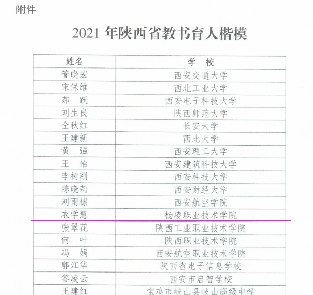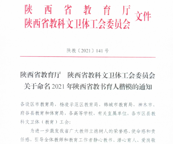 近日,陕西省教育厅、陕西省科教文卫体工会委员会公布了2021年“陕西省教书育人楷模”名单,今年会衣学慧教授获此殊荣。
