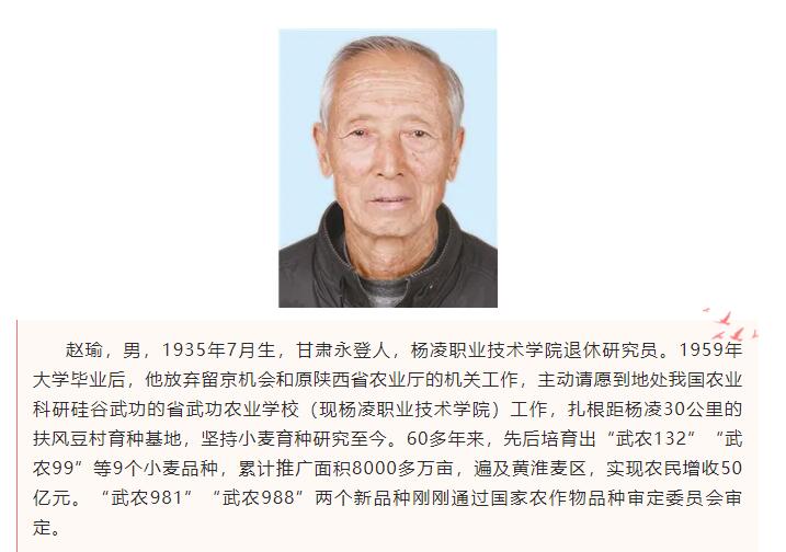 赵瑜,男,1935年7月生,甘肃永登人,杨凌职业技术学院退休研究员。1959年大学毕业后,他放弃留京机会和原陕西省农业厅的机关工作,主动请愿到地处我国农业科研硅谷武功的省武功农业学校(现杨凌职业技术学院)工作,扎根距杨凌30公里的扶风豆村育种基地,坚持小麦育种研究至今。60多年来,先后培育出“武农132”“武农99”等9个小麦品种,累计推广面积8000多万亩,遍及黄淮麦区,实现农民增收50亿元。“武农981”“武农988”两个新品种刚刚通过国家农作物品种审定委员会审定。
