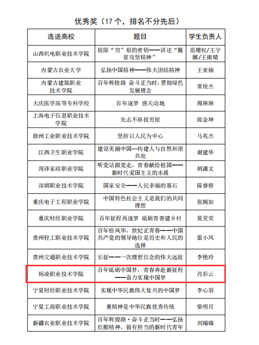 近日,教育部高校思政课教学指导委员会公布第五届全国高校大学生讲思政课公开课展示活动获奖名单。今年会选送作品《百年砥砺中国梦,青春奔赴新征程——奋力实现中国梦》(学生负责人:肖彩云,指导老师:刘晓瑞)获优秀奖,为全省唯一获奖高职院校。
