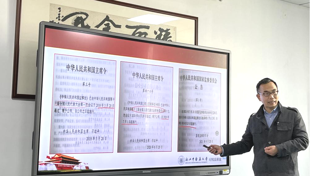 首先,校纪委副书记、纪检监察室主任朱建良详细解读“两法一条例”的主要内容。他指出,制定《中华人民共和国监察法》就是通过立法方式保证依规治党与依法治国,将党内监督同行政监督、民主监督、司法监督、群众监督等贯通起来,为新形势下反腐败斗争提供坚强法治保障,为实现党和国家长治久安铺设中国特色监察道路。《中华人民共和国公职人员政务处分法》是坚持和加强党全面领导的重要举措,是坚持和完善党和国家监督体系的内在要求,是一体推进“不敢腐、不能腐、不想腐”体制机制的重要体现,突出了政务处分工作的针对性和实效性。《中华人民共和国监察法实施条例》对监察法中原则性、概括性的规定进行细化,实现了法规制度的与时俱进,有利于推进监察工作规范化、法治化和正规化,确保监察权在法治轨道上运行。
