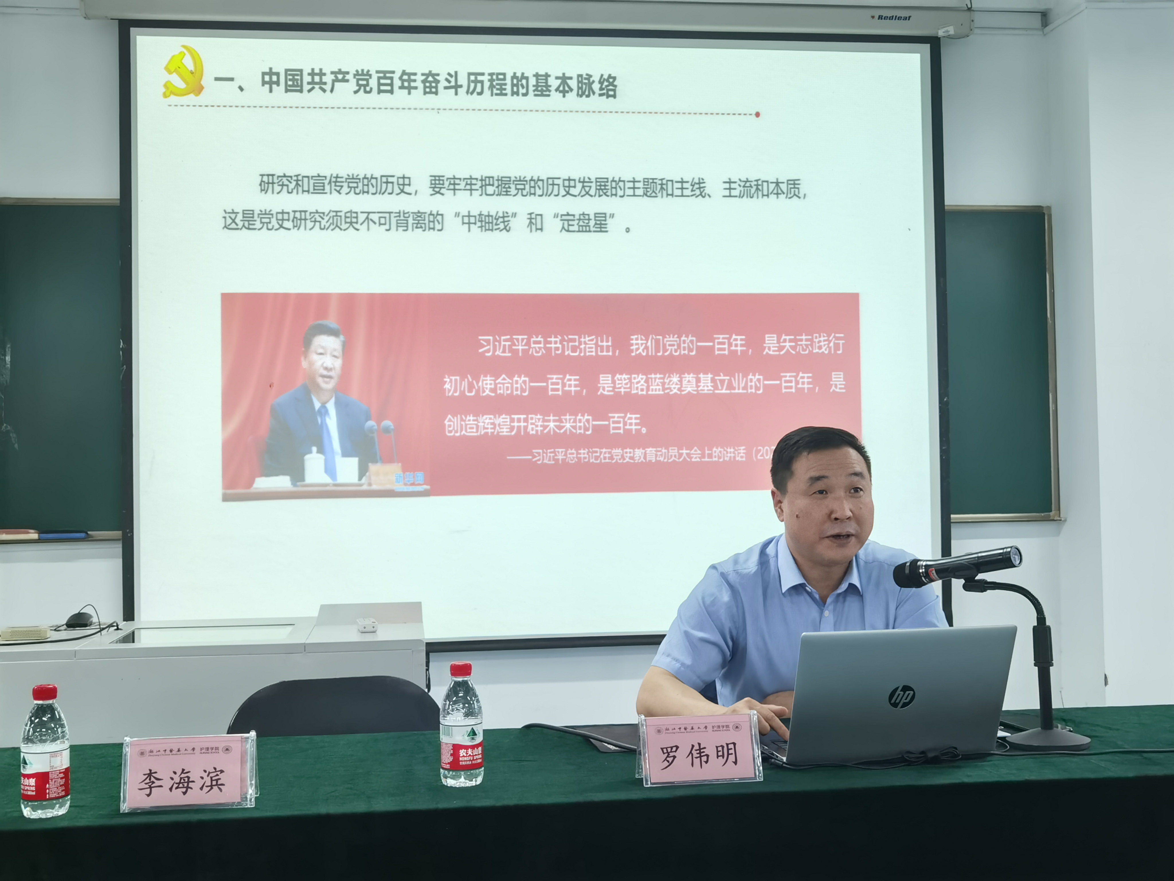 首先,罗伟明副校长对万象城awcsport官网在第十届中国大学生医学技术技能大赛护理学专业赛道中取得全国第九的好成绩表示热烈祝贺。随后,罗校长从中国共产党的百年奋斗历程的基本脉络、中国共产党人百年奋斗的精神谱系、中国共产党百年奋斗的经验与启示、《习近平在浙江》采访实录和“习近平科学的思维方法在浙江的探索与实践”研究成果等四个维度介绍中国共产党百年奋斗经历与基本经验。重点分析了“中国共产党为什么能”、“马克思主义为什么行”、“中国特色社会主义为什么好”三大问题,深入浅出,旁征博引,历史小故事娓娓道来,让师生们对中国共产党的百年奋斗史有了更清晰地认识,更加坚定“四个自信”。