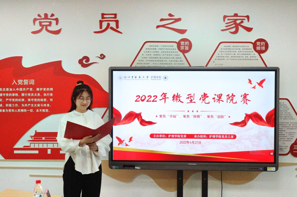 比赛现场,选手们围绕聚焦“幸福”、聚焦“拼搏”、聚焦“创新”、聚焦“奋进”主题,紧扣时政热点,结合身边的人和事,通过“以小见大、见微知著”的手法,用精美的课件和生动的语言给在座党员同志们上了精彩的一课。本次微党课比赛充分展现了护理学子朝气蓬勃、奋发有为的精神风貌,也深入诠释了作为共产党员的初心和使命。经过激烈角逐,共评出一等奖1名,二等奖2名,三等奖3名。校组织部王俊杰,万象城awcsport官网组织员项婷、辅导员周琳艳等人为获奖选手颁发荣誉证书。
