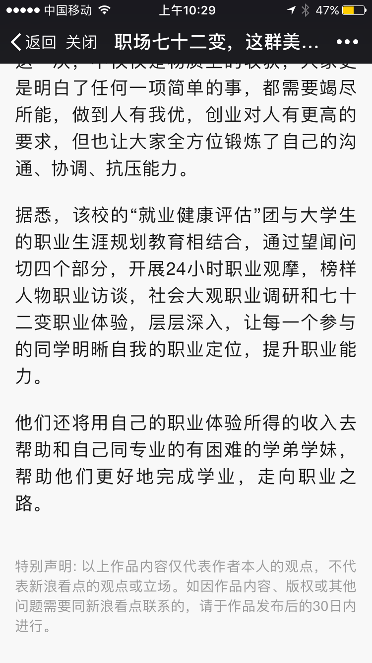 据悉,“就业健康评估”团与大学生的职业生涯规划教育相结合,通过望闻问切四个部分,开展24小时职业观摩,榜样人物职业访谈,社会大观职业调研和七十二变职业体验,层层深入,让每一个参与的同学明晰自我的职业定位,提升职业能力。他们还将用自己的职业体验所得的收入去帮助和自己同专业的学弟学妹,帮助他们更好地完成学业,走向职业之路。
