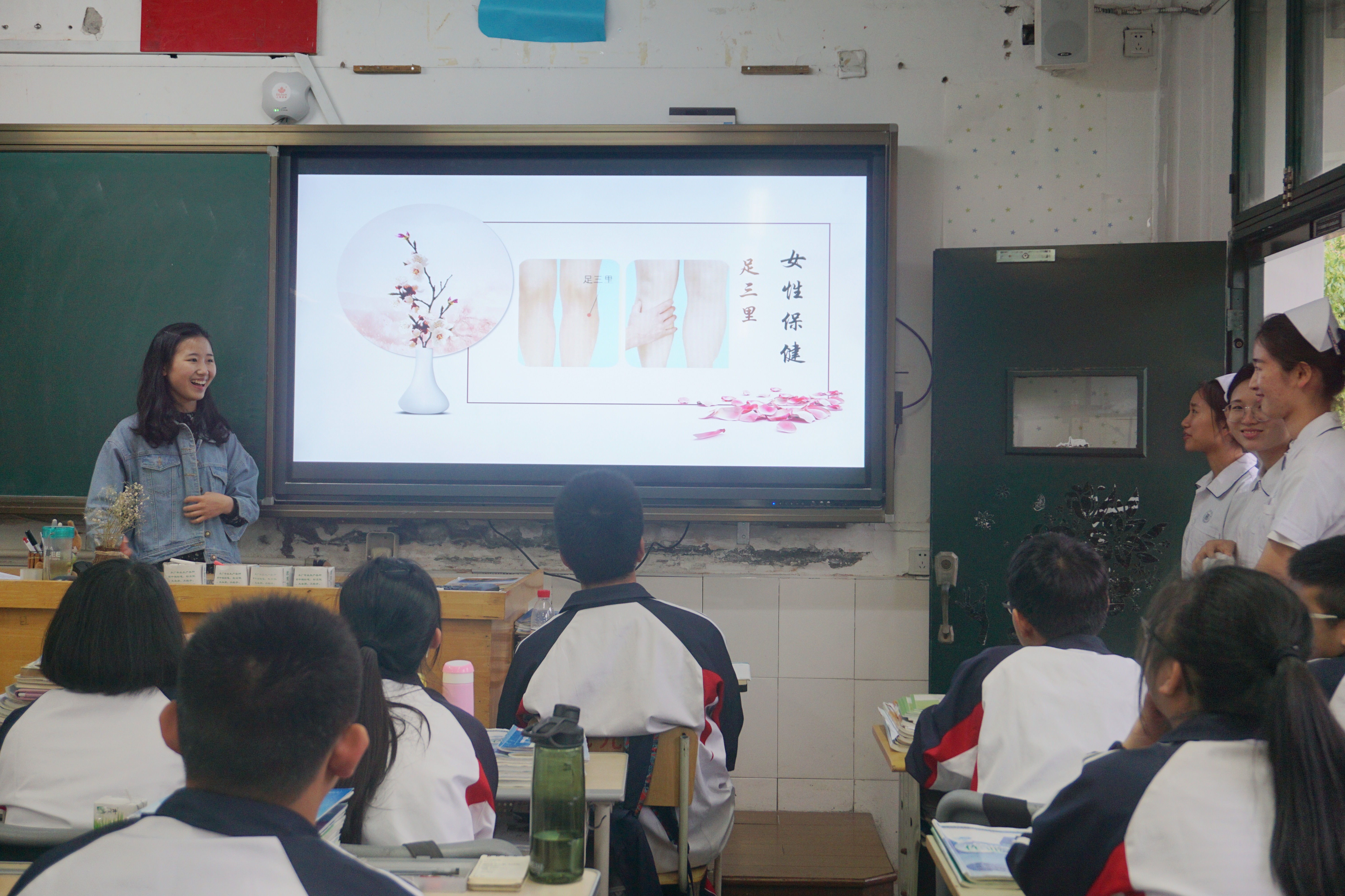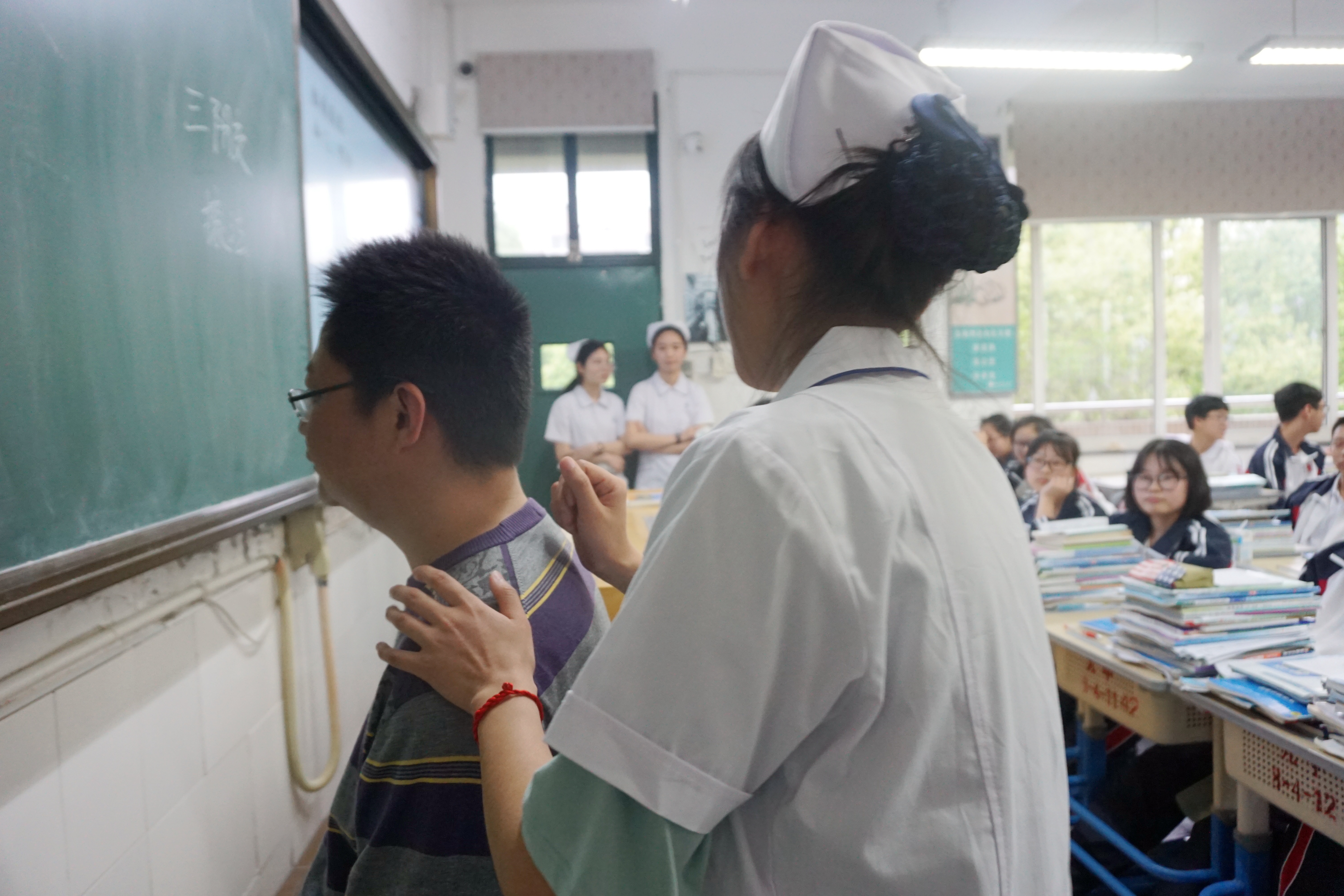 活动以穴位按摩教学开始,通过对足三里、命门、肾俞等日常保健穴位的详细讲解和按摩手法的现场演示,传播中医文化的博大精深。在学习过程中,中学生自告奋勇上台体验操作,活跃了现场的活动气氛,加深了同学们的具象记忆。正值青春年少,时光正好,作为祖国未来的希望,中学生迫切需要具备紧急情况下的自救能力,活动现场也涌现出学习急救包扎和心肺复苏的热潮。派发止血绷带,零距离观摩,环形包扎法、螺旋包扎法、“8”字包扎法,针对不同情况采取不同的包扎手法,课堂井然有序。“1001、1002……”,心肺复苏过程中果敢、慎微的精神也感染了在场的中学生,让他们近距离领略到白衣天使的绰绰风姿,更体会到医护工作者的妙手仁心。合照前的他们笑靥如花,似火热的激情,如绽放的青春。