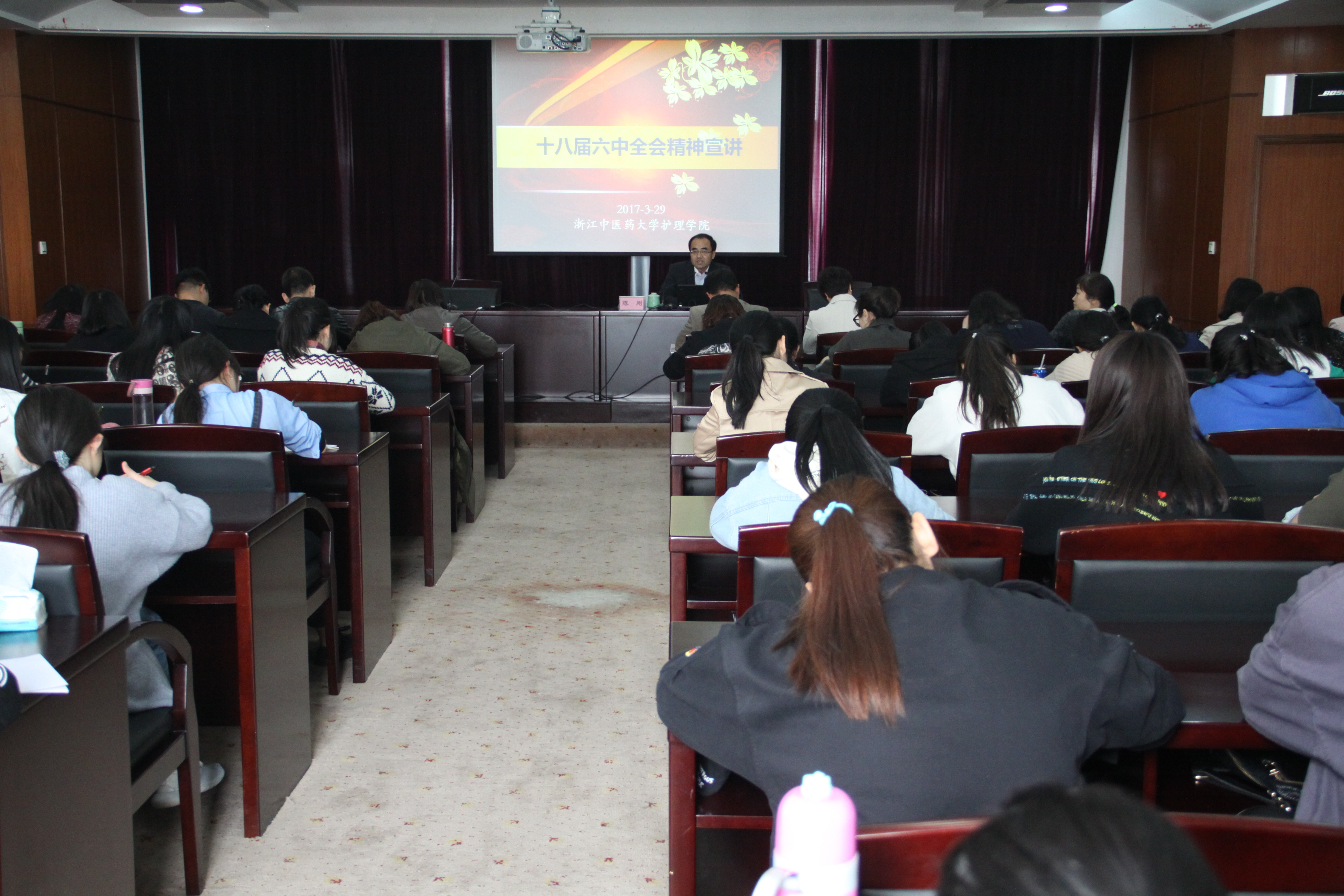 为了深入学习贯彻党的十八届六中全会精神,贯彻落实党要管党、从严治党的方针,全面提升“四个意识”,发挥党员的先锋模范作用,增强基层党组织的创造力、凝聚力、战斗力。3月29日下午,万象城awcsport官网党总支在23号楼8楼一会举办了“十八届六中全会精神宣讲会”,会议特邀校党委副书记陈刚教授主讲,万象城awcsport官网党政领导、各党支部书记、全体在校教工、学生党员共70余人聆听了陈书记精彩的专题党课。