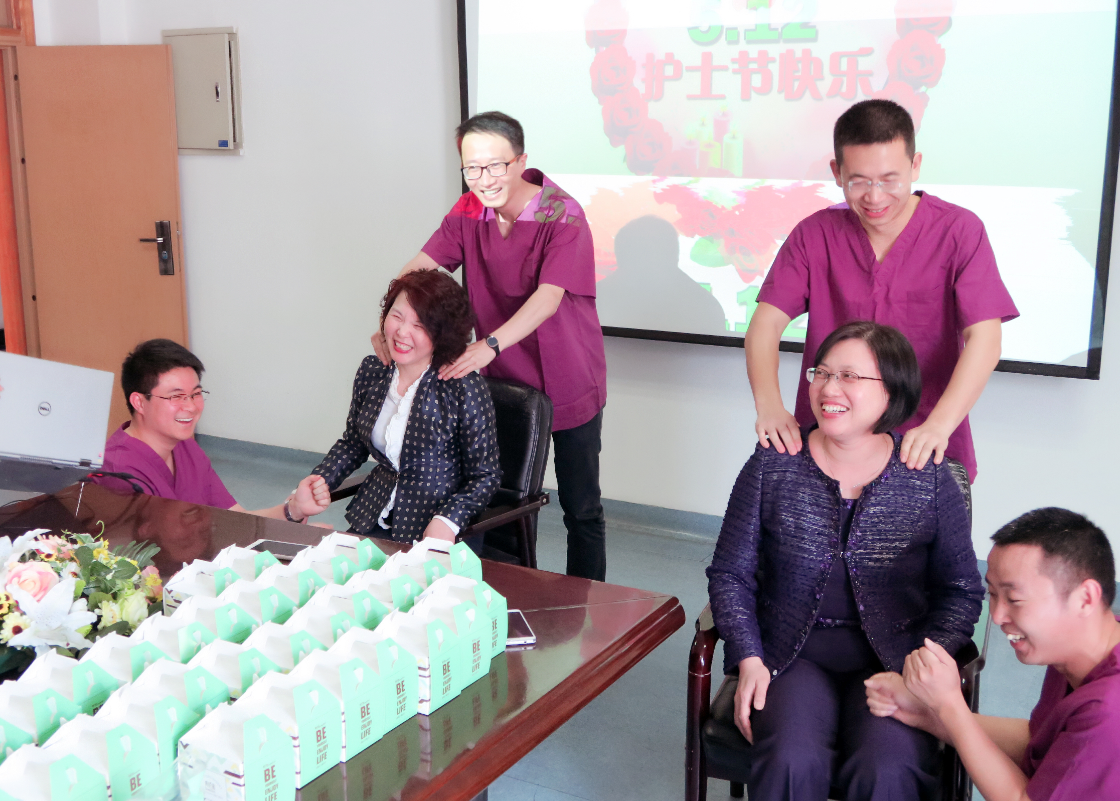 万象城awcsport官网全体男教工为学院的女老师执行点将送蛋糕服务,并主动提出为学院老师提供修理电脑、专业推拿按摩等服务内容,对于下单需要推拿按摩服务的老师现场兑现。送礼和问候服务热情活泼,活动现场气氛融洽,笑声连连。