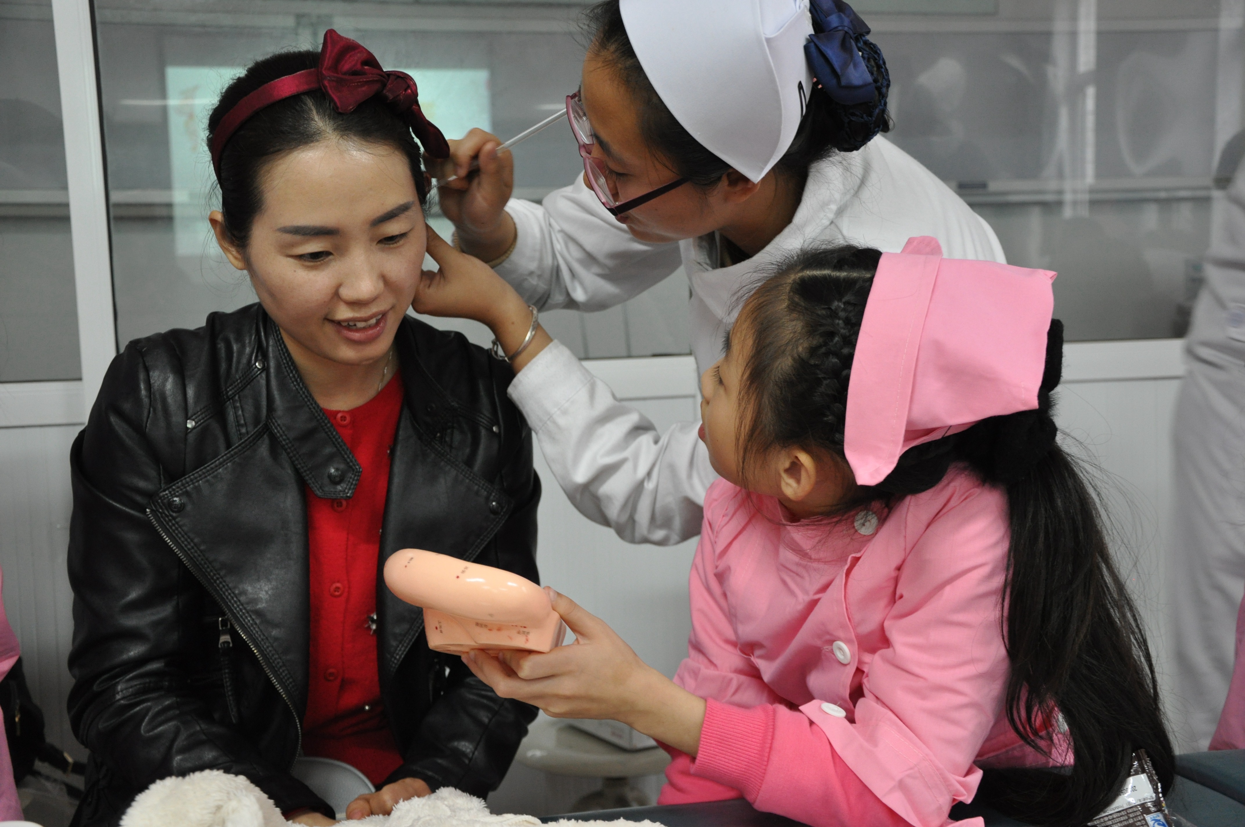 “小天使课堂”活动开始,主持人以“我是小护士”引开,用护士的服饰激发小朋友们的兴趣,并通过分发小奖品的方式鼓励小朋友们积极参与课堂。积极踊跃的参与,很快让每一位小朋友都得到一份与众不同的奖励——“小小护士服”。粉红色的护士服,俏皮可爱的护士帽,换上护士服的小朋友们显得精神奕奕俨然一个个真正的小护士。接着通过情景表演、新闻引入等,为小朋友们引入止血包扎、CPR急救操作等教学内容。9名衣着整齐的准护士们担任此次课堂的小老师,为小朋友们和家长们一一教学,指导专业的医疗知识和急救操作。同时,也鼓励小朋友们走上讲台,为大家进行演示。作为具有中医特色的护理学专业,耳穴压窦的中医护理操作技术也是此次的重点教学内容。在小老师们的指导下,小朋友们亲手为家长们进行运耳、探穴、点压等专业操作。