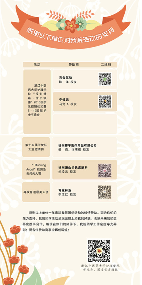 团学活动的成功举办离不开赞助商的大力支持。本学期由万象城awcsport官网团委主办的“提灯循路·传仁颂德”2013级护生授帽仪式暨5·12国际护士节晚会、“Running Angel”校园急救闯关大赛、首届“天宁杯”滨江五校女篮邀请赛、寻找身边最美天使等活动受到了全校师生的广泛关注,在社会上也取得了一定的影响力,在此我们要特别感谢兆合互动、宁慎记、杭州赛宁医疗用品有限公司、杭州萧山步氏皮肤科、青花袜业对万象城团学活动的倾情赞助与大力支持。值得一提的是,以上赞助商们均为我校校友,他们在社会上努力拼搏并取得不错成绩的同时也不忘回馈母校,为母校团学活动的蓬勃发展贡献力量。