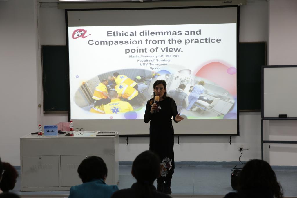 Maria教授,博士,硕导、博导,主要研究方向为急诊和临床护理、护理伦理等。在讲座中,Maria教授分享了她关于急诊护理中的伦理冲突的研究报告并介绍了不同文化视域下同情在护理理念的差异性。讲座后,多位研究生对国际交流产生浓厚的兴趣,并表示有意愿去西班牙URV大学访学。