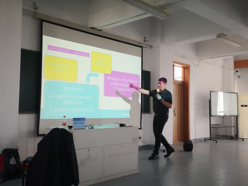 Sven教授主要围绕“How the nursing education is organized in Belgium and clinical reasoning”(比利时的护理教育是如何组织和临床推理)主题进行介绍,带领大家走进比利时的护理教育。首先Sven教授向大家介绍了比利时的地理位置、气候、语种和各种美食等,激起大家极大的兴趣。然后,Sven教授采用PPT与视频结合的方式,着重介绍了西弗兰德大学的人才培养模式、学科建设、教学特色等,并热切欢迎大家到该校留学。