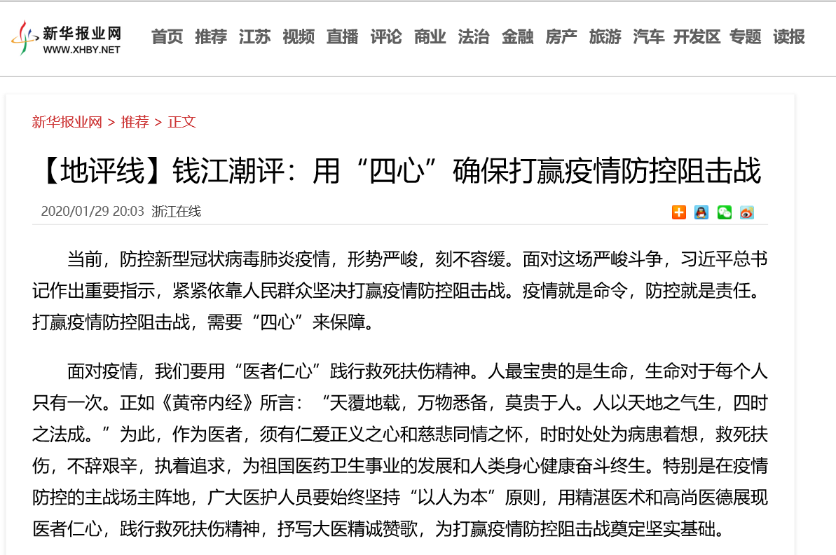 近日,面对新型冠状病毒感染肺炎疫情的严峻形势,万象城党总支书记方年根积极响应党中央、省委和学校党委关于坚决打赢疫情防控阻击战的号召,强化责任担当,加强宣传引导,在与学院班子成员一道带领学院师生员工认真贯彻落实上级关于疫情防控各项工作要求基础上,勇担舆论引导责任,积极撰写评论文章,先后于1月29日、2月1日和2月4日在《浙江在线》“钱江潮评”栏目发表《用“四心”确保打赢疫情防控阻击战》《打赢疫情防控阻击战须“真情实意”》和《再大的“冰雪”也挡不住春天来临的脚步》三篇评论,其中《用“四心”确保打赢疫情防控阻击战》和《打赢疫情防控阻击战须“真情实意”》两篇评论迅速被全网转载(包括光明网、中国新闻网、央广网、中青在线等),发挥了较好的鼓舞群众、引导群众、凝聚群众的作用,为打赢疫情防控阻击战提供了有力舆论支持。