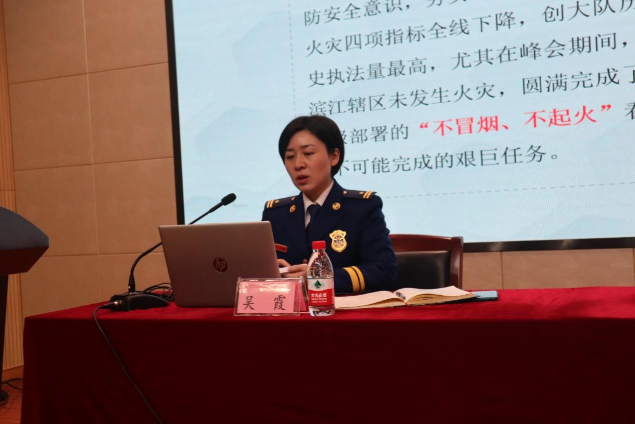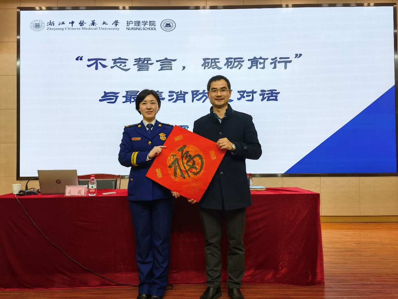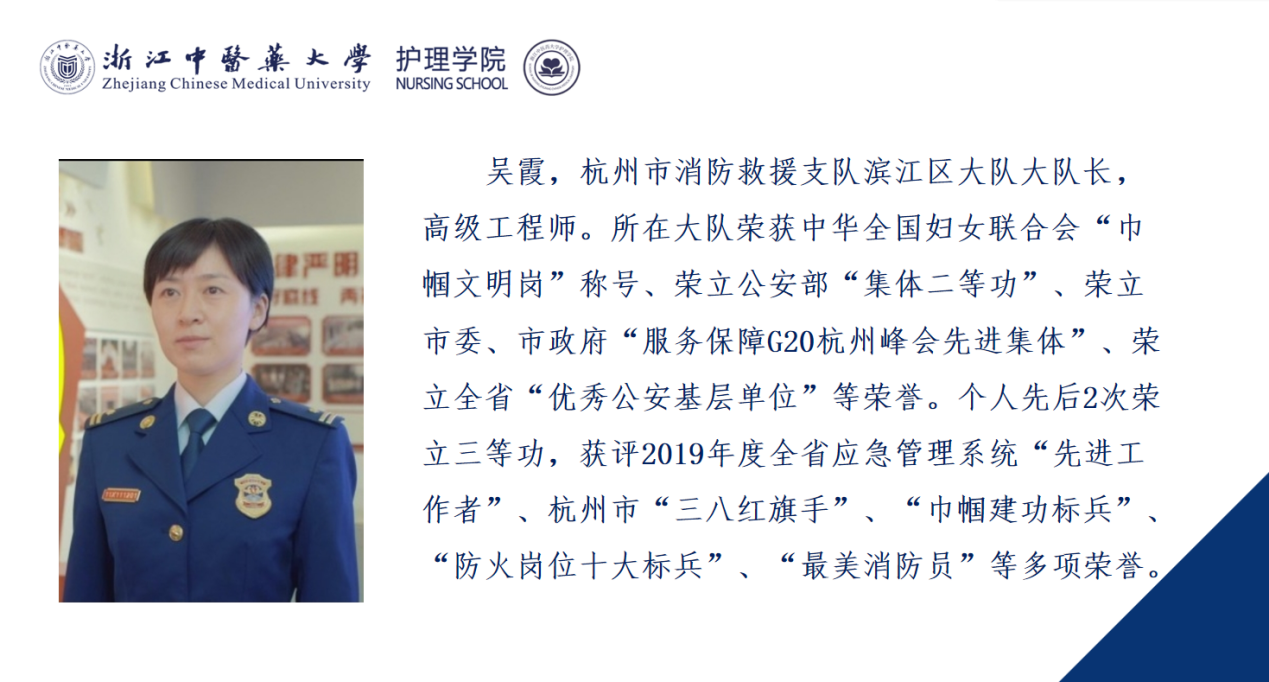 12月23日,“最美杭州人”——滨江区消防大队吴霞大队长应邀走进万象城awcsport官网“最美讲堂”,分享感人事迹,实践榜样力量。讲座由万象城党总支副书记林觐民主持,万象城awcsport官网2019级全体同学参加本次讲座。