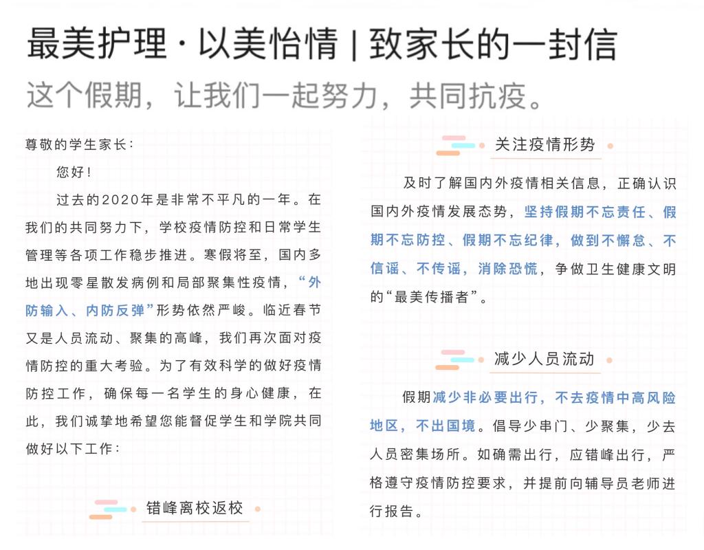 全程管理,落实防控措施。疫情出现反扑后,辅导员迅速摸排全体本科生、研究生的信息,准确梳理各类数据,制定“一人一档”离校学生信息表,确保离校学生底数清,返家行程可追踪。全体辅导员始终保持高度的责任心和使命感,确保相关要求通知到每一名同学。为提升学生居家学习效率,万象城awcsport官网在《致家长一封信》中邀请家长一起引导学生居家学习,健康生活。