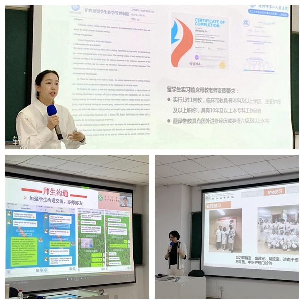 随后,周云仙副院长详细解读了护理学本科留学生培养方案和实习大纲。分别从培养目标、实习大纲及实习手册三个方面着重介绍。强调国际留学生应具备较好的临床护理能力、职业素养和发展潜能,培养他们具有国际视野,并能在各国医疗卫生、保健及康复机构从事护理工作的能力。同时,周云仙院长根据最新中英双语编制的《留学生毕业实习手册》,介绍了毕业实习的组织与管理,实习时间及各科实习教学大纲,各科室毕业实习记录表等内容。这些内容总体来说与同专业同层次中国学生趋同,同时也有部分留学生的特色。