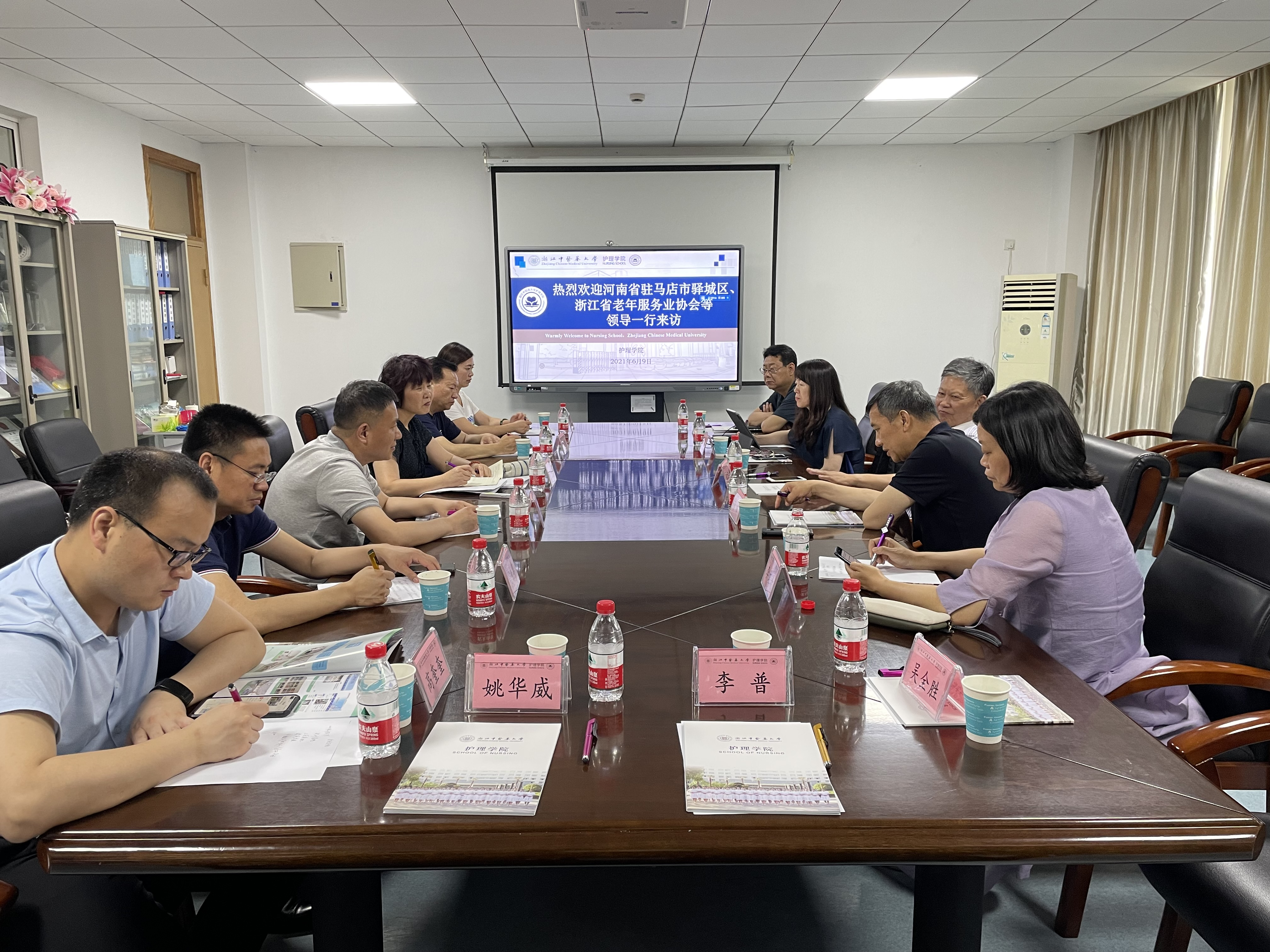 6月9日下午,浙江省老年服务业协会会长徐佳增、副会长周微、河南省驻马店市驿城区政协主席秦峰、政府副区长李文清、民政局局长刘东、颐康阳光养老中心董事长任有军、居家养老服务中心总经理王菁等一行10余人赴万象城awcsport官网调研学习,万象城awcsport官网院长何桂娟、党委书记李海滨、党政办主任李慧君、老年社区护理负责人杨莉莉、社会培训合作部主任沈丽佳等出席接待。
