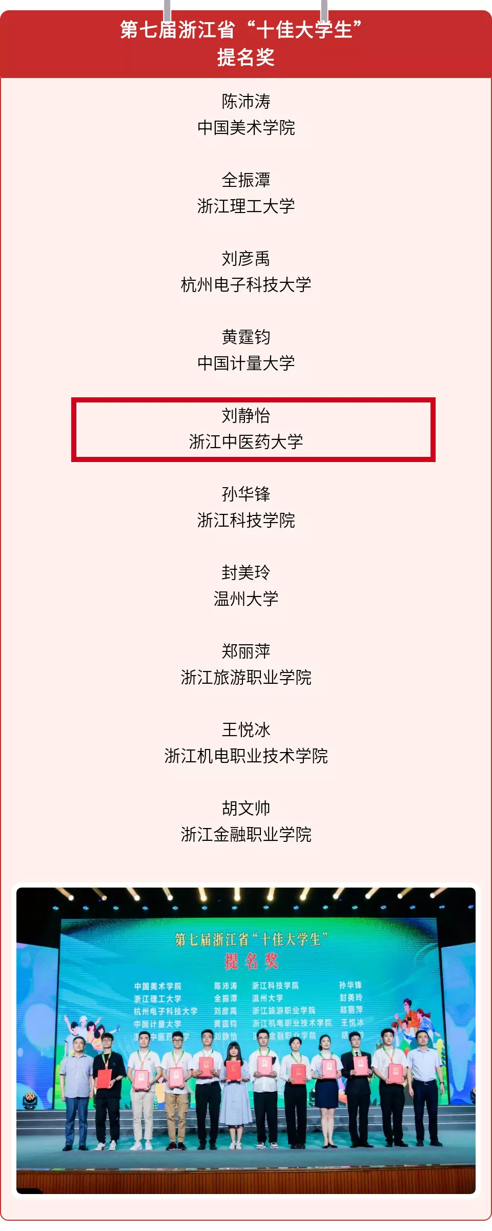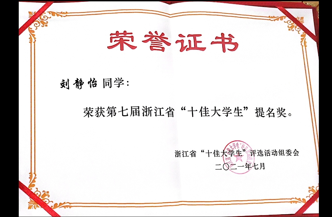 近日,第七届浙江省“十佳大学生”颁奖活动落下帷幕,我校万象城awcsport官网2021届优秀毕业生刘静怡同学获浙江省“十佳大学生”提名奖。今年4月,省委宣传部、省教育厅、团省委、浙江广电集团联合开展省第七届“十佳大学生”评选活动,共有来自77所高校的候选人111位参与,最终30位同学成功入围评选活动,万象城刘静怡同学荣获提名奖。