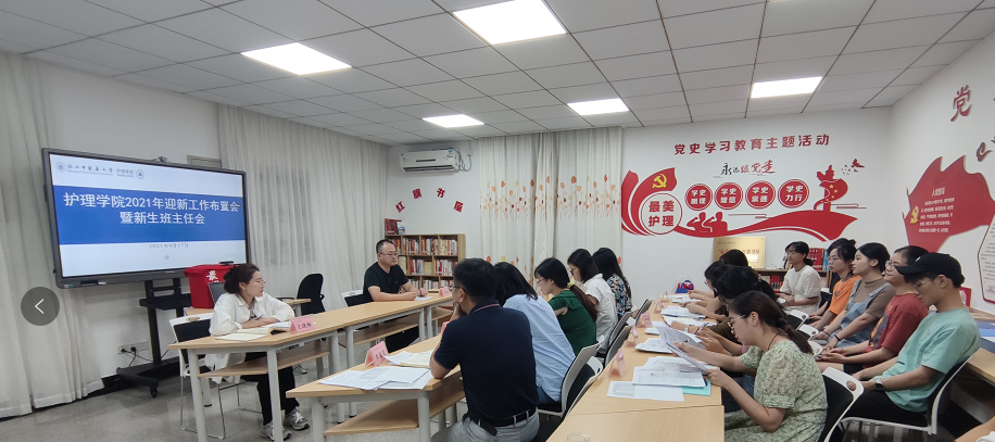 2021级辅导员宋增元对2021级新生班级情况、前期准备、防疫要求、报到当天流程和班主任工作进行了详细的介绍,强调了迎新期间安全防范教育的重要性。团委书记王晓梅对迎新工作中的活动安排进行了补充说明,讲解了学院班主任管理办法。李海滨书记代表学院向各班主任致以诚挚的感谢,并对大家的工作寄予厚望,希望每一位班主任能守牢安全底线,并深入开展基础文明和学风建设工作,努力营造积极向上的班级文化。多关注西藏生以及部分家庭经济特别困难的学生,引导学生尽快适应大学生活。同时希望大家秉持院训精神,建设最美护理,为培养新时代的护理骄傲共同努力。