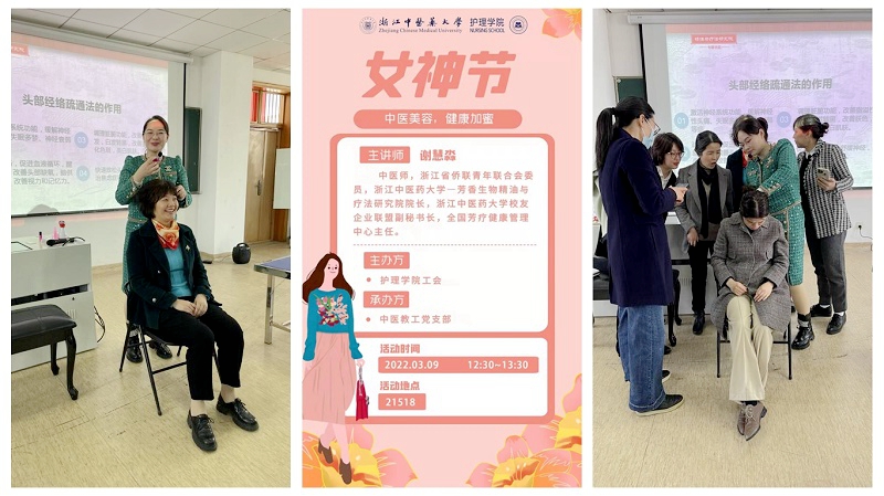 花开三月,春意盎然。为庆祝“三八”国际劳动妇女节,3月9日,万象城awcsport官网工会联合中医教工党支部组织开展“中医美容,健康加蜜”工会活动,并邀请全国芳疗健康管理中心主任谢慧淼老师为学院老师作专题讲座。