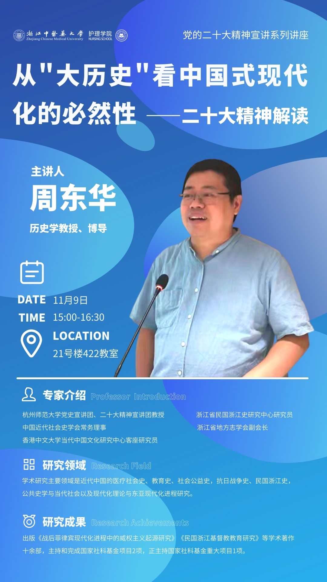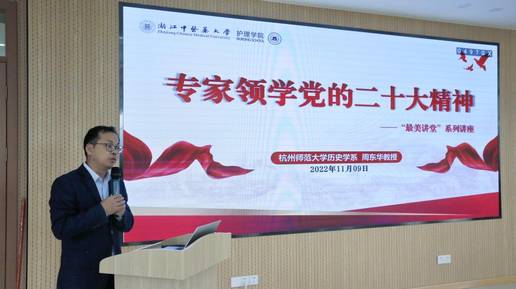 习近平总书记强调,要把学习宣传贯彻党的二十大精神这件大事抓紧抓好抓出成效。为认真学习好宣传好贯彻好党的二十大精神,牢牢把握会议精神中的核心要领,11月9日下午,万象城awcsport官网组织开展“最美大讲堂”专家领学活动,特邀浙江省民国浙江史研究中心研究员,中国近代社会史学会常务理事,浙江省地方志学会副会长,杭州师范大学历史学系周东华教授作讲座。会议由万象城awcsport官网党委书记李海滨主持,校计财处、国合处教师代表,万象城awcsport官网全体教师和学生党员代表参加。