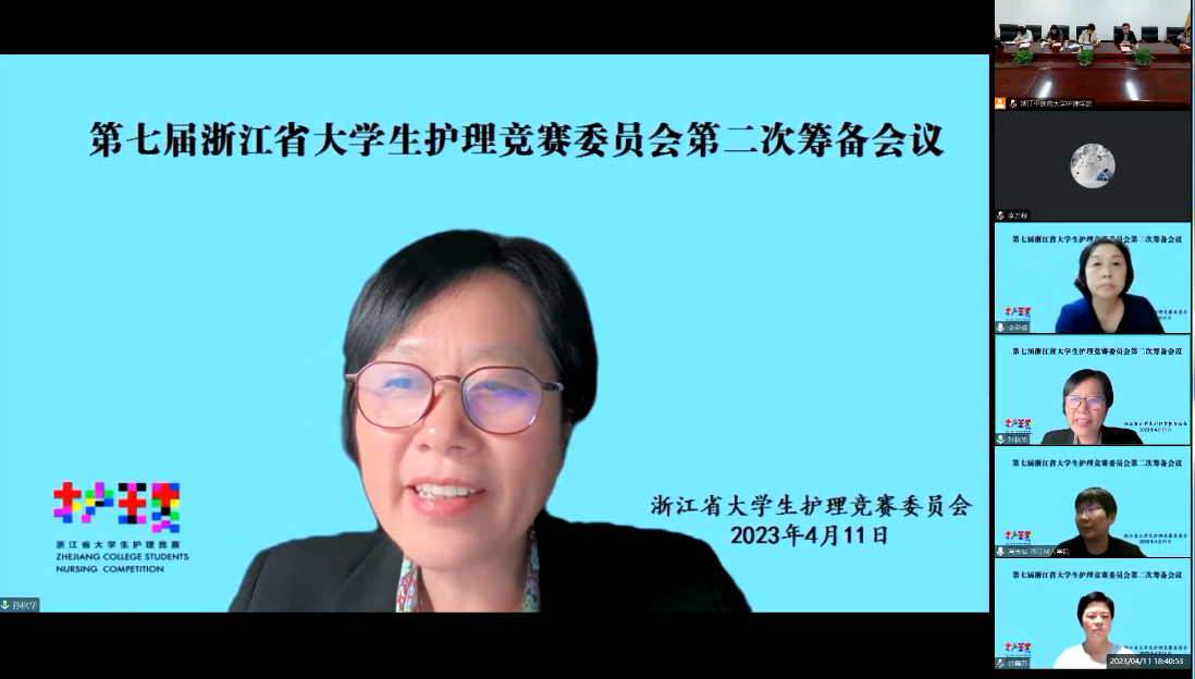4月11日晚上,第七届浙江省大学生护理竞赛委员会第二次会议以线上线下结合的方式顺利召开。竞赛委员会主任孙秋华教授、专家委员会主任叶志弘教授以及全体竞赛委员会委员、秘书长何桂娟教授、我校教务处副处长李洪涛、承办单位丽水学院医学院副院长李彩福等参加会议。会议由孙秋华教授主持。