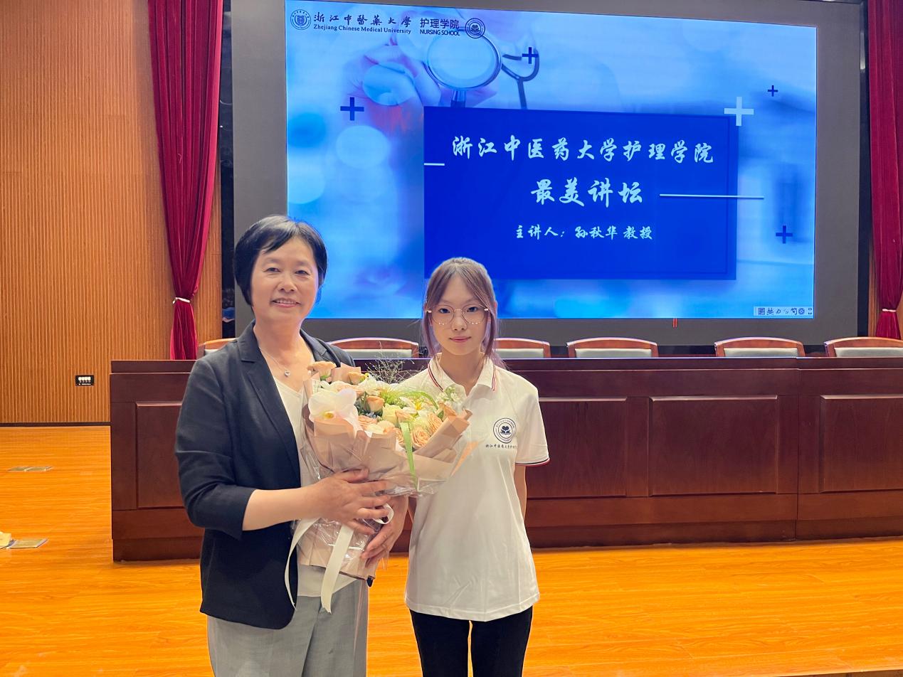 为表示谢意,助产学2班尹佳瑶同学作为学生代表为孙教授送上鲜花并合影留念。此次讲坛不仅仅是一场讲座,更是对2024级新生心灵的启迪,希望2024级最美护生不负使命、奋力前行,成为更好的自己,为实现美好的人生梦想添砖加瓦。