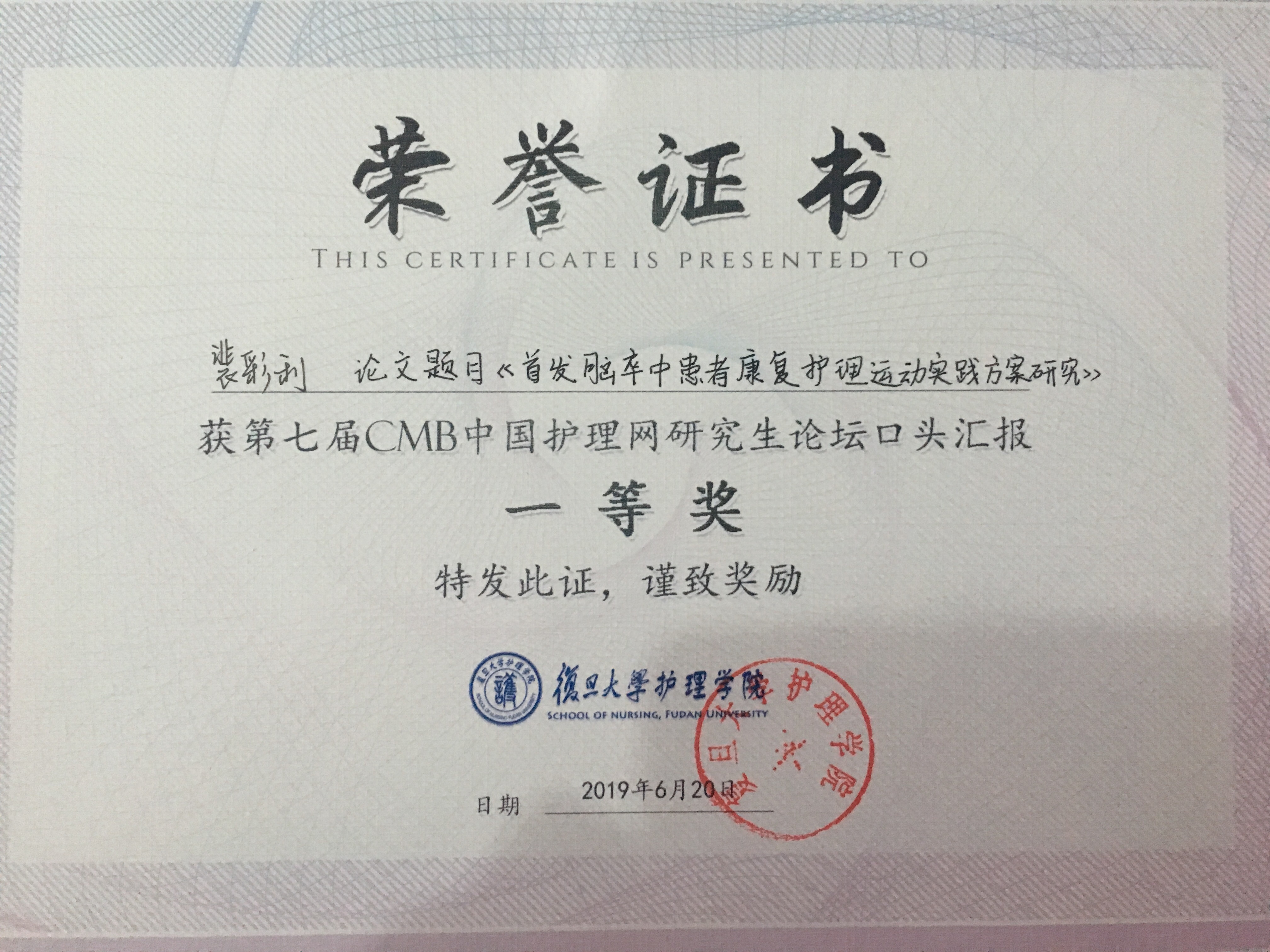 本次比赛共设一等奖2名,二等奖6名,三等奖7名。评审委员会对140多篇论文摘要进行书面评审后择优选取11名博士研究生、32名硕士研究生参与论坛现场口头汇报交流,评委对所汇报的论文就研究意义、研究严谨性、结果的创新性、汇报的表现力等进行评审,裴彩利同学脱颖而出,荣获一等奖,可喜可贺!一定程度上这也是对我校护理学研究生培养和教育的一种肯定与鼓励。未来,一定会有更多的“裴彩利”走上CCNN,为自己证明,为校争光!