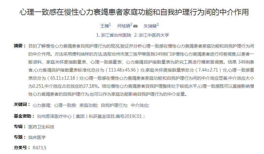 由何桂娟院长指导的研究生论文从慢性心力衰竭患者自我护理行为的现况出发,验证并分析心理一致感在慢性心力衰竭患者家庭功能和自我护理行为间的中介作用,结果提示慢性心力衰竭患者自我护理整体处于较低水平,心理一致感既可以直接影响慢性心力衰竭患者的自我护理行为,也可以作为家庭功能影响自我护理行为的中介变量。