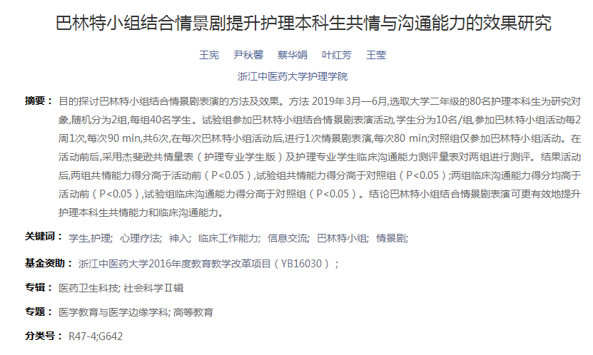 王宪老师以大学二年级护理本科生作为研究对象,通过运用巴林特小组结合情景剧表演活动的方式,采用杰斐逊共情量表(护理专业学生版)及护理专业学生临床沟通能力测评量表进行测评,探讨巴林特小组结合情景剧表演对护理本科生共情能力和临床沟通能力的效果。