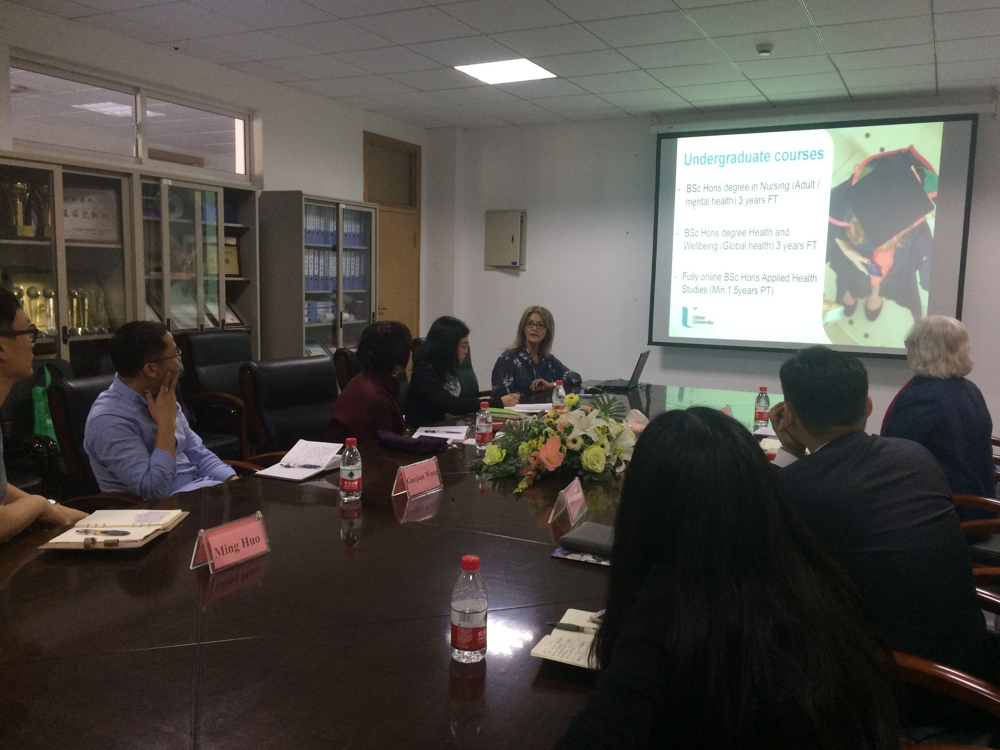 何桂娟院长向阿尔斯特大学的两位教授表示欢迎,并介绍了万象城awcsport官网的历史沿革、护理和助产专业的学科建设、师资队伍和教学条件等。随后,阿尔斯特大学的Carol教授也介绍了该校的概况,包括地理环境、专业设置和学生就业等。Donnell教授详细介绍了该校护理专业的基本情况。阿尔斯特大学,地处北爱尔兰,其护理专业目前英国排名第5,具有本科、硕士、博士三个层次。地彼此了解后,双方就可能开展的合作进行讨论,关于本科生的“2+1+1”合作模式和研究生的“1+1+1”合作模式有开展的可行性达成共识。另外,关于开展学生短期交流项目、教师科研合作和师资培训等项目也做了深入沟通和交流,双方高度认可彼此的合作基层,愿意尝试各种新的项目,以促进彼此学科和文化的交流。
