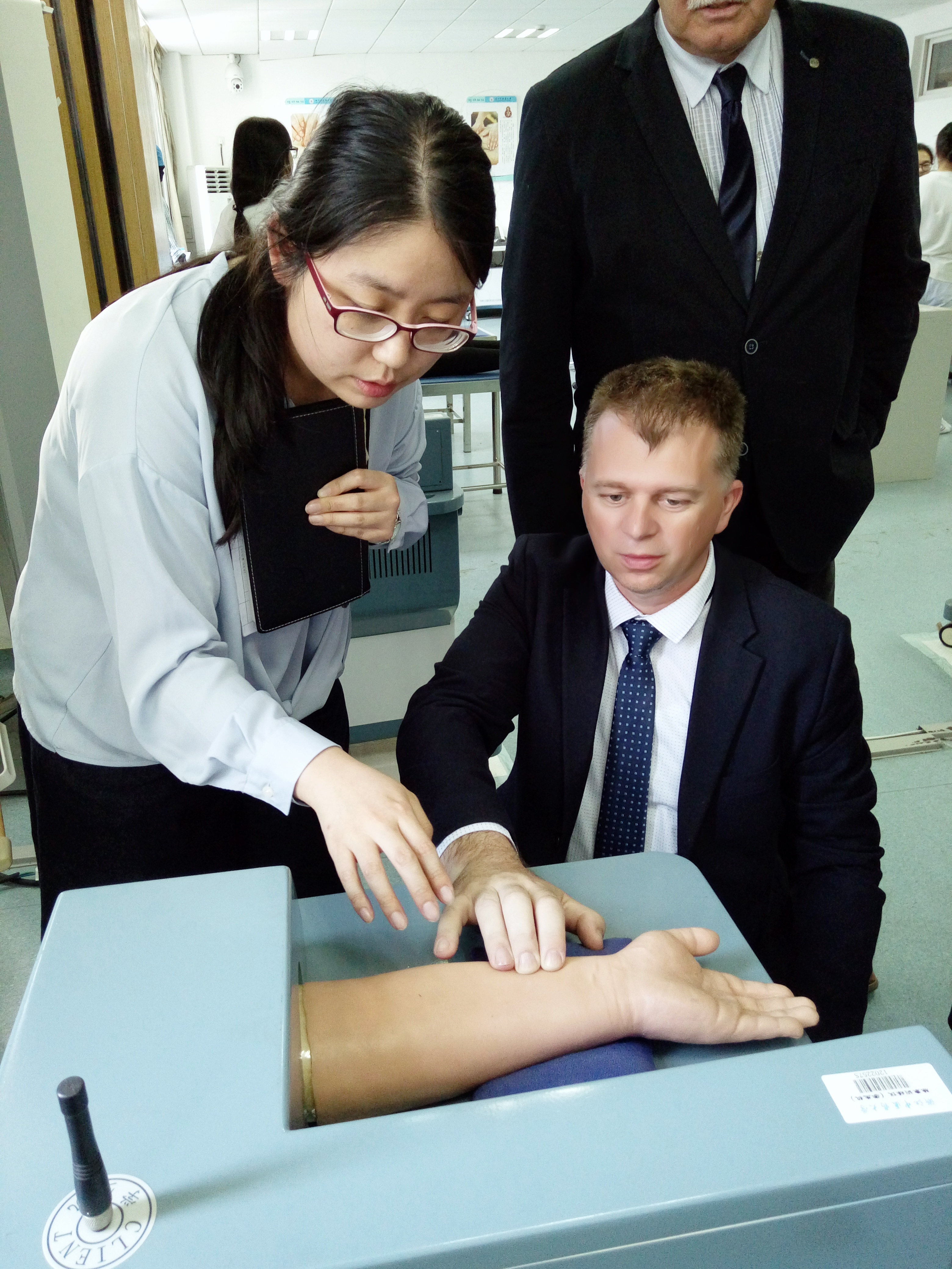最后,捷方代表参观了万象城的实验室和模拟病房。中医护理实验室内诸多中医与护理的结合元素让他们流连忘返。Petr Konečný先生还亲自体验了一把脉诊仪和舌诊仪,万象城中医护理专业教师楼数慧全程陪同翻译,充分展现了中医护理的魅力。