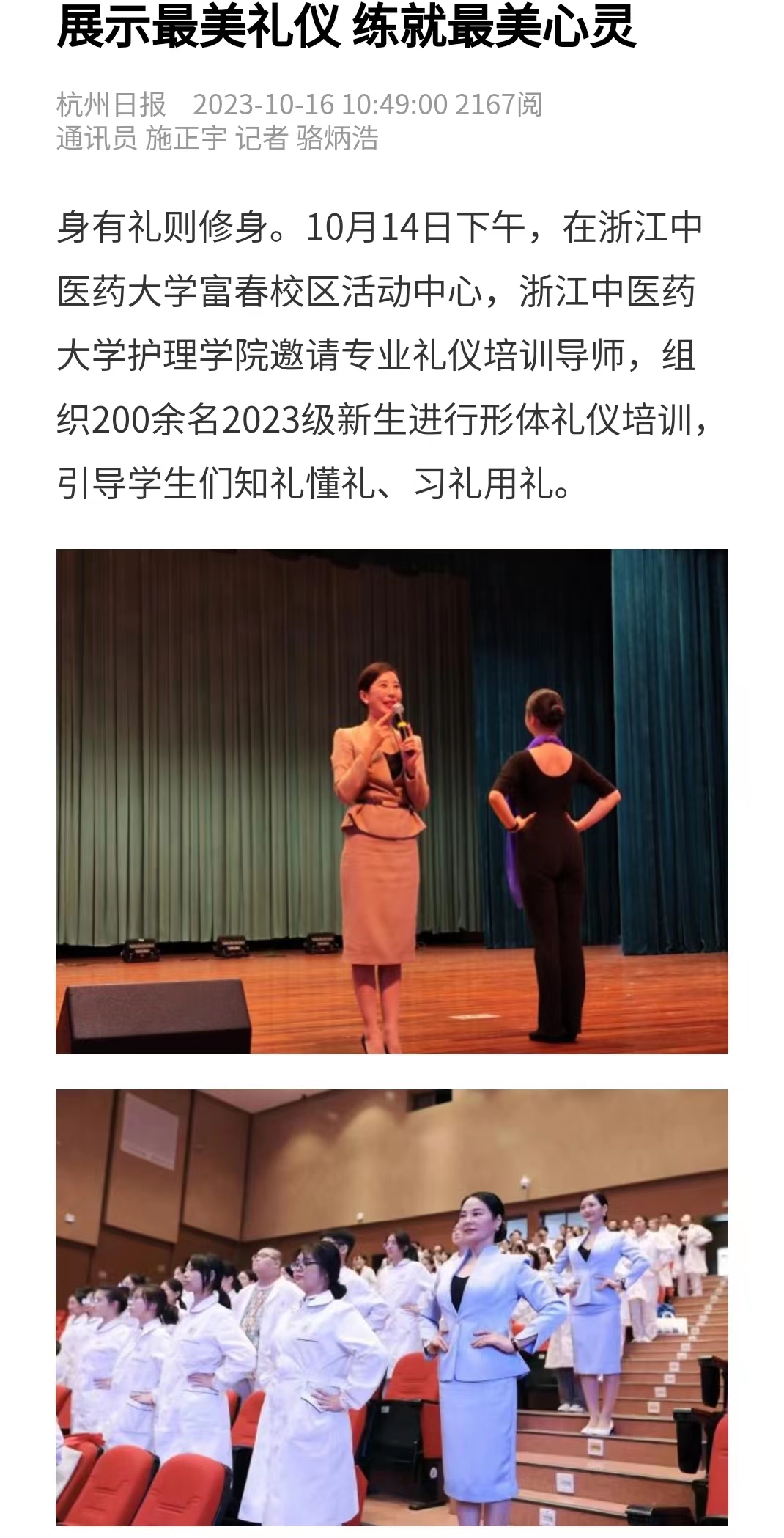 身有礼则修身。10月14日下午,在万象城awcsport官网富春校区活动中心,万象城awcsport官网邀请专业礼仪培训导师,组织200余名2023级新生进行形体礼仪培训,引导学生们知礼懂礼、习礼用礼。