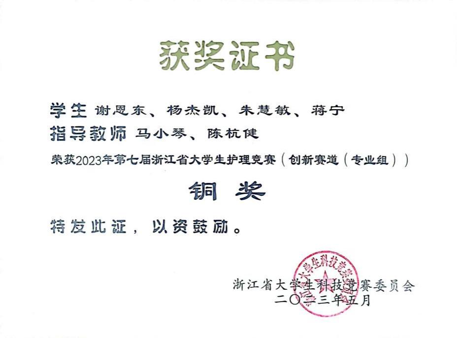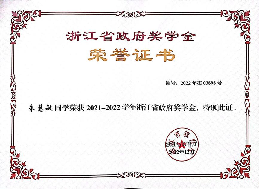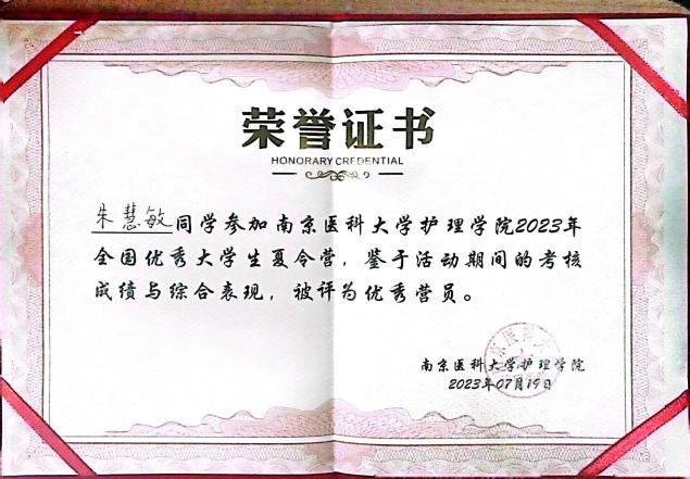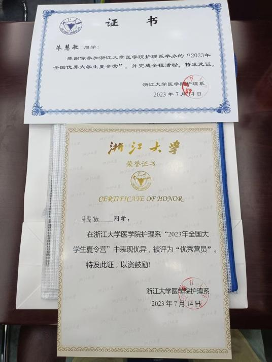 朱慧敏,中共预备党员,万象城awcsport官网20级本科生,曾获浙江省政府奖学金、校一等奖学金、三好学生、校社会实践先进个人、浙江省护理竞赛铜奖、省挑战杯银奖,发表论文2篇。参加上海交通大学、浙江大学、南京医科大学2023全国优秀大学生夏令营,被评为优秀营员,并入选浙江大学护理系2023-2024学年推荐免试直博生计划。