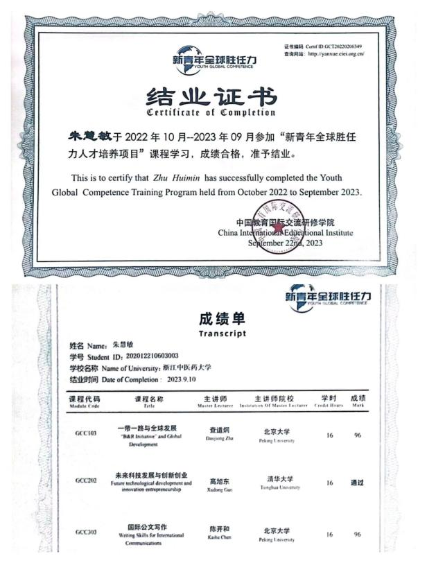朱慧敏参加“新青年全球胜任力培养项目”结业证书