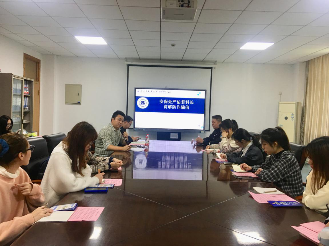 首先,严佑君科长详细地向同学们解读了《致学生的一封防诈骗信》,倡导校园师生要严加防范,提高辨别能力;脚踏实地,不要好高骛远;理性消费,抵制不良网贷。同时要做到“五个五”防骗要点:五不信;五不露;五不转;五不做;五慎接。